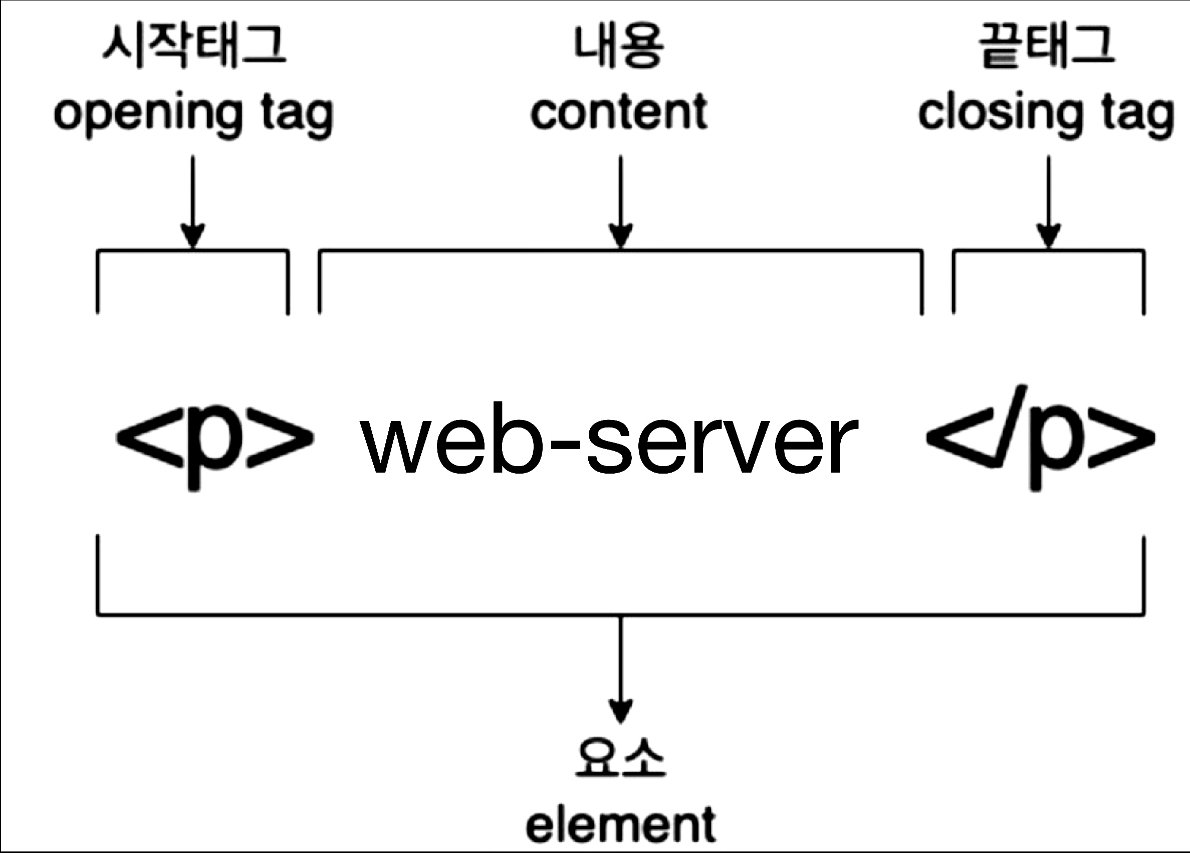 - 내용의 왼쪽에 있는 것이 시작 태그(opening tag)이고, 내용 우측에 있는 것이 종료 태그(closing tag)입니다.